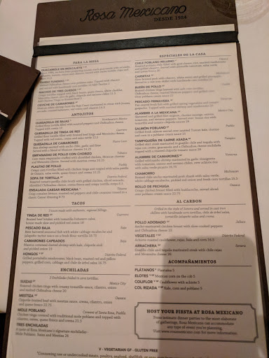 The prospect of paying more than 10 dollars for mexican is a tough sell -- but if you are willing to give it a shot, rosa mexicano offers a nice atmosphere and with great staff, but marginal food (for the price). As almost everyone says, get the guacamole -- they made it fresh at your table and you are able to customize it to your liking. Be careful though, its very filling. Bonus: they will keep replenishing chips to further expand your gut. We ordered the budin de pollo (which was alright -- but I am not sure I would recommend it) and the salmon poblano (which was slightly dry but the kale below it was amazing). Our friends ordered the flank and the shrimp which they both liked. All came out in huge portions with enough sides to satisfy the table While overall the food was okay (better the day after) I was slightly disappointed in the quality of the food (the dry salmon and lackluster chicken) for the price. If the chef was paying attention, the salmon could come out moist and flakey, but instead it was overcooked resulting in a dry meat which required the sauce to moisten it up. Part of me felt like I have had better mexican at a local shop then what I got a Rosa Mexicano. A final nail in the coffin what that even our Sangria came off tasting a bit like sprite. The atmosphere is gorgeous and our service was quick and attentive. This is what saved me from a more disappointing review. With such a beautiful location and wonderful staff, I hope they can start paying attention to food quality -- otherwise I would recommend looking elsewhere because the price didnt match the quality of the final product.