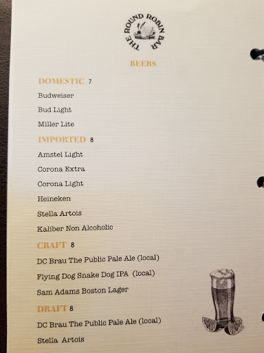 This is THE bar in DC. There are other bars, like at the Old Ebbitt Grill, that are great "power" watering holes ... but ... at the Round Robin, you never know whos going to be there. One of my most memorable meetings was Andrew Lloyd Weber. As he sat next to me, reviewing his latest production at the National Theater, I asked him, "Are you who I think you are?" His sly response, "It depends on who you think I am." The service is always thoughtful and attentive. Once youve been in, the folks at the bar will remember you and what you enjoy.
