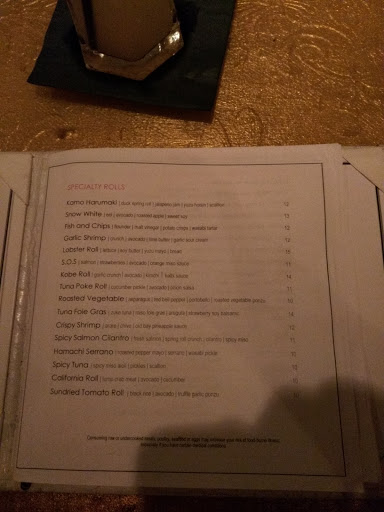 Mixed review- I appreciated the flexibility in changing our table upon request. We thought the Wasabi Guacomlaa was superb, steak sushi a great twist and flavor, Salmon dish excellently prepared and flavor with its accompaniments of kale /edamame. Duck was overcooked but they gladly re cooked. Hubby was not as impressed, initially offended by being asked to remove his cap, ahead of opportunity to do so own his on, and seeing a seated guest with his hat still on. While I would return and try more of the sushi & small plates, Hubby doesnt plan to come again