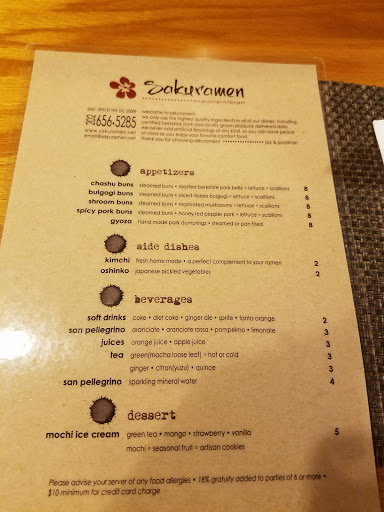 Wow. I thought Toki Underground was the best ramen in DC, but I was wrong. Sakuramen takes the cake! Sakuramen is in the basement of one of the row houses on the main strip in Adams Morgan. You walk in and theres one long community table that would be typical in Japan and around 10-12 smaller tables for two. Right away we were seated and the server asked for our order (They obviously are trying to get people in and out due to the popularity of this place, but I never felt rushed at all). My wife and I ordered the bulgogi buns for an appetizer. The bulgogi was as good as any Ive had in Korea and it comes on these amazing buns that look like a thick tortilla. One order includes two buns so its perfect for two! My wife and I ordered two very different ramens but both were amazing. My wife lives spicy and ordered the Spicy Miso. If you cant handle spice like me, stay away because it is legit spicy. I ordered the Tonkotsu Mild. I love meat and love non-spicy foods and this was the perfect meal for me. To top it off at the end, we ordered mochi. The texture is very different from the ones from Trader Joes but they come on a cool plate with fruit on it and a chocolate cookie stick. You must go here! Best ramen in DC hands down!