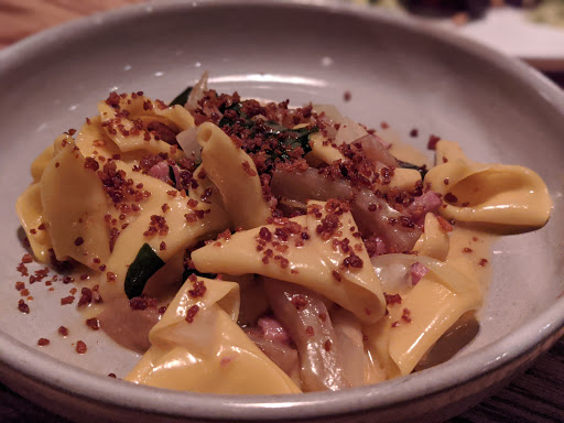 Absolutely fantastic service with even better food. There are interesting flavors on every plate. We ordered the rabbit sausage, cavatelli, sweet potatoes, and the guinea hen. While the rabbit was good, the cavatelli and the sweet potatoes were out of this world. The cavatelli is a wonderful mixture of spicy, sweet, savory, along with the every important pig fat. This dish is an absolute must try. The bread crumbs provide a much enjoyed crunch to breakup the pasta and ragu. The guinea hen was also fantastic. The whole roasted hen was complimented by various roasted mushrooms and drenched in a white wine sauce. Some mushrooms were soft and chewy while the mitake mushrooms were crunchy. The way that the chef plays with textures is out of this world. Every dish has some sort of crunch that completes a smooth textured base. Finally, the deserts. We ordered the carrot and pineapple cake. This was another beautiful dish. The cake was topped with ice cream and pecans. Be sure that you are kind and entertaining to your waiter as you might get a special desert on the house not on the menu!