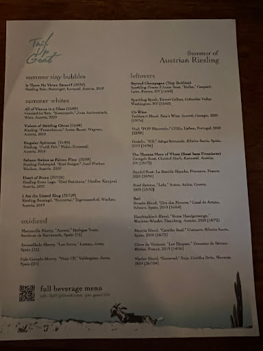 Tail Up Goat is a new favorite and a welcome addition to Adams Morgan. Delightful, surprising food. Exceptional, friendly, service. Beautiful atmosphere and a well curated collection of wines, beers, liquors. Excellent cocktails. Located just off of Adams Mill in the new Adamo building, Tail Up Goat is tucked away just enough to feel separate from the loud hustle and bustle of the typical AdMo crowd. The restaurant is beautifully decorated with in a subtly island theme with lots of wood, rope, and a softly blue wall. It simultaneously feels chic and cozy. Theres a good amount of bar seating. The menu is focused, constantly changing, and extremely well executed. Theres a lot of technique and a lot of creativity as well. They put a lot of thought and care into their food and it shows. Some recent examples: The rabbit sausage with marinated radicchio and fennel mustarda were perfect bites. The smoked rutabaga ravioli with basil mint pesto was a surprising, genius combination of flavors. This is not a small plates menu, but they are perfect for sharing. The breads and pastas are made in house. The menu is inviting, but also exciting for foodie-types. The desserts were equally unique, familiar, and delicious. Try the budino! (pudding) Equal attention goes to the drinks with a curated collection of bottles, a dozen Italian Amari, and an excellent cocktail program. Lots of delicious, non-alcoholic options as well. I cant rave enough about the service. The hostess recognized us after our first visit and she went out of her way to make us feel at home. Im excited to bring friends here and more so to become a regular.