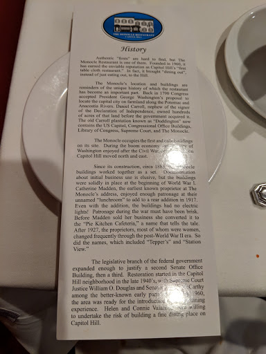 The Monocle is located right next to the Capitol. Often times you will see congressmen dining here. Pictures of politicians line the walls. Our server and host were extremely nice and helped us pick items from the menu. The food was very good and the ingredients appeared fresh.