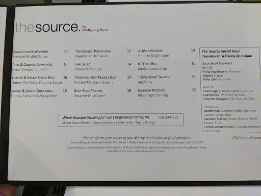 People were excited for Momofuku + Milk Bar to move to DC, but little did we know the best Asian food and cookie place was right under our noises. A solid 5 star rating for The Source. The restaurant itself is very simple with no art on the walls. Just solid color walls and simple tables. One would think you were in a fancy Soviet restaurant, but do not be fooled. The food and service are both fantastic. We went here for my wifes birthday and they made her feel very special. During the course of the meal, they surprised us with an appetizer and dessert at the end on the house. In reading all the Yelp reviews before we went, we decided to NOT order an entree and just get several appetizers and sides. It ended up being more than enough food for the two of us and some of the best food weve had in DC. Heres what we ordered: 1) The won ton soup. They prepare it right in front of you and it was the BEST won ton soup weve ever had full of flavor. 2) Spicy tuna tartare. They brought this out on the house and my wife loved it. It comes in two small cones and had the perfect balance of spice and a little sweet kick. 3) The selection of dim sum. This is the perfect dish to share with one other. Each dim sum comes out in pairs and each had great flavor especially the shrimp one. 4) Seared wagyu beef. If you dont mind your meat served rare, youll love this. Its premium meat with a few sauces on the side to add to the flavor. If you shy away from rare meat like me, dont order this. 5) Wok fired Thai drunken noodles. Wow. Just wow. My wife is a drunken noodle connoisseur and she said this was the BEST shes ever had. Even I loved the taste. It wasnt too spicy. 6) Fried rice. If my wife is a drunken noodle connoisseur, I am a fried rice connoisseur and this was the BEST Ive had....EVER. It comes with a soft fried egg on the top making it perfect. 7) The chocolate chip cookies with a glass of milk. Amazing. The best cookies Ive had in DC hands down and probably the best Ive ever had second to Levain Bakery in NYC. They come out warm and more than enough for two people (I think there was 8 cookies total). 8) Cocktails. One of the best weve had in DC. My wife ordered her usual negroni and said it was the BEST shes ever had anywhere in the world. It comes in a very cool glass and is premium alcohol. I ordered two drinks that were perfectly sweetly crafted- Passions something and Pandoras something. :) Wolfgang Puck, you got it right...AGAIN!