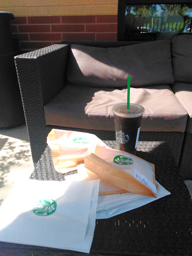 While visiting Florida I went to this Starbucks that my sister says she goes to regularly. It has an awesome outdoor seating area (remember this is Florida and it is often sunny and warm outside). We parked in the lot and entered and immediately ordered four coffees. We were lucky to get two comfortable cushioned chairs (one for my mother whose uses a walker), and I sat at a counter facing the area where the workers make the coffees and other drinks. Personally I found the background music a bit too loud and distracting, but it was just bearable. I have been to one Starbucks in New York City where the music was up to full blast and very hard on the ears. Overall it is a pleasant place to have a coffee break. There is an outdoor window for customers who want to take out items, and the WiFi works very well.