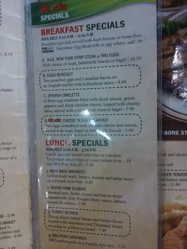 My husband ordered a mushroom & cheese omelet, when he began eating it he realized that it was a western omelet and when the waitress took the ordered she had written western omelet and charged us for the mushrooms and cheese, when we spoke to the woman manager that was at the register she basically said "oh well", terrible customer service, would you have not reimbursed for the mushrooms & cheese since it was not our error. The mananger is rude, we will never return there asnd we will tell everyone how bad the service is there . J. Hechmer Auburndale, FL