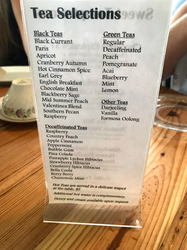 Im from out of town & every time I am here visiting my family I must come here! The menu has a nice selection. Tried a few different items & all were delicious. I noticed a few new items & looking forward to trying them. They always have a nice special. Their scones are tge best! Always order to go. its a wonderful little place with the cutest decor. There is a nice shop where you can purchase some beautiful items. The service there is wonderful! You are greeted with a smile & the staff has been very friendly. The chef even came out to our table one time & I was able to compliment him on the dish.. Highly recommend this place, been to couple of other tea rooms in surrounding area & this one is the best!