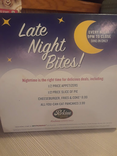 Nobody wants a suprise at 11PM. Perkins gives a reliable meal when other options are limited.