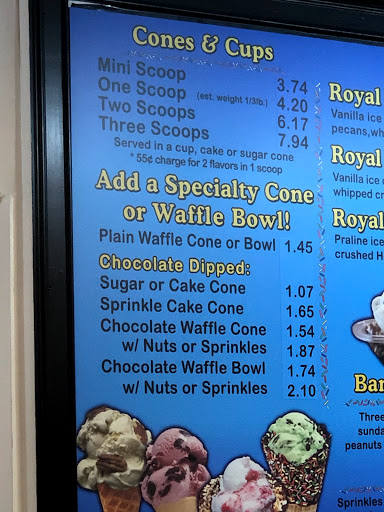 we went to get one of our favorite treats, a royal scoop ice cream . to our disappointment the size of the cone was very, very small. the ice cream didnt even fill the waffle cone or the waffle bowl. we really exspected more for $10.00. we noticed a change the last time we were there but we gave you another chance, only to be disappointed again. i surely hope you go back to the way you use to scoop ice cream.