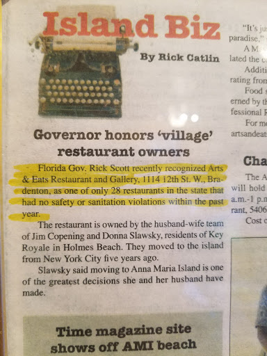 This is my first Google review ever and Im pleased that its for this restaurant--Arts & Eats deserves it. The food and service are both impeccable--truly the best Ive received in Bradenton--and I anticipate repeated trips back here to sample its Tuesday specials. The Tuesday evening crowd was minimal, a bit of live music, and outdoor seating was wonderful. I could see it being a bit bustling on the weekends, located in the Village of the Arts, but the homemade dishes are definitely worth it. Five stars, easily.