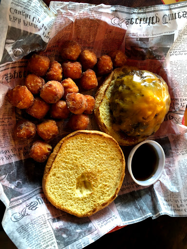 My burger was small. We were also the only group in the entire small restaurant and it took our waitress five years to refill our drinks and bring our simple dishes. I also got a side of sweet potato tots with my burger not knowing they have cinnamon sugar on them. I dont like that so I asked for a side of them without and they burnt them. It was ok food, nothing to write home about and the service is sub par at best.