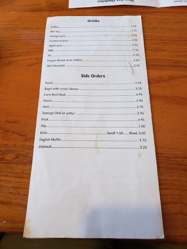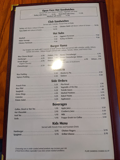 Good food. Usually good service. Fairly good prices. Excellent menu - from cheeseburgers to salads to Greek food including Spanakopia (sp?) and gyros. Greek fish, roast beef, corned beef, and other dinners. There are a few good vegetarian options, including salads and spinach pie. We like eating here.