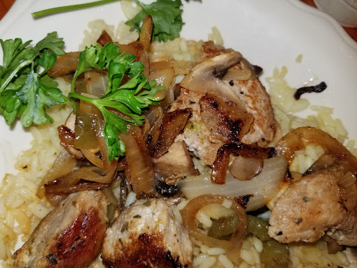 I seem to like the chicken kabob platter as I always order this to-go after a hard day at work when I do not want to cook. It is a healthy offering of grilled chicken with mushrooms, onions, peppers and pilaf rice and 2 wedges of grilled tomato which I thought was decoration and a filler in the to-go box but are tasty as well so eat them. You get homemade tzatziki sauce for the chicken a greek side salad and pita bread. Mine even came with a complimentary serving of homemade rice pudding. All very yummy and reasonably priced too!