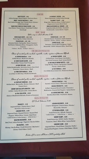 Good Italian Food I had the Veal Marsala and my husband had eggplant and we both liked it. We have also had lunch a couple of times and were very happy with the service and food.