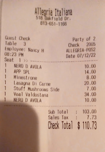 Great independent owned Italian Restaurant in Brandon, forget those chain restaurant, you have have to check this spot out. Not a lot of seats in the place but it seats about 100 give or take. The food was outstanding and the wine selection wasnt bad and not overpriced. Me and the wifey will definitely be back try other dishes. I am a restaurant chef at a hotel in downtown Tampa and this is the BEST Italian restaurant we have eaten in Tampa. All I say is check it out and bring the family, support the locals and not the chains. The service might need some training, but I will take food over service anytime of the week. For date night it was good spot to just get out and spend quality time with my wife and not be bothered when we dont get out a lot. Thats wrong with people and chain restaurants, we are always in rush, turn and burn, spend time with people you love and take time to ask about there day. I eat to love, not love to eat....