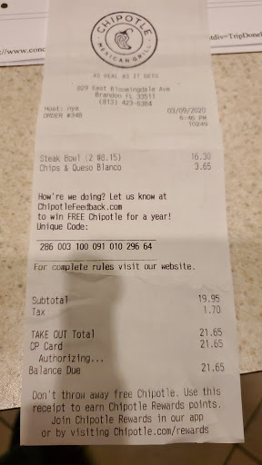 Stingiest chipotle in Brandon. The less food they put in, the prouder they are of themselves while they train each other. Already pay almost 8$ a meal, fill it up to make it worth it or take off 2$. I love chipotle, but this location is a turn off.