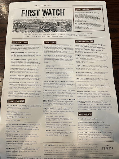 Im a huge breakfast fan, but beyond that Im a huge FIRST WATCH fan! They have lots of healthy, friendly options but everything is incredibly yummy! The biggest pancakes, most refreshing juices, absolutely to die for "healthy turkey" eggs. They also have lunch options but I get breakfast no matter when I come! The environment is refreshing and clean (and lovely) and the employees always make you feel like youre their favorite customer. They do get BUSY! So call ahead to get a spot! They also have a nice community table.