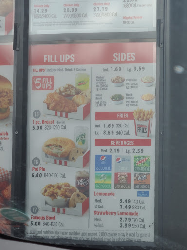 The last few times I have eaten at this location has been horrible. After our latest visit, I guess we had the last batch of the night because my husband and I got the most disgusting watered down Mac n cheese ive ever had here and super dry chicken strips. And the drive thru girl forgot our cookies for the $5 fill up. Come on KFC get it together.