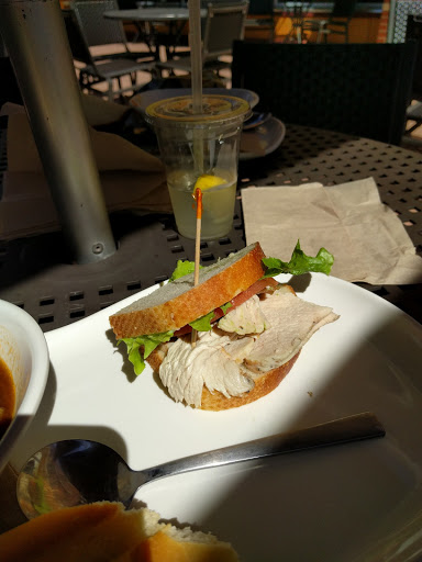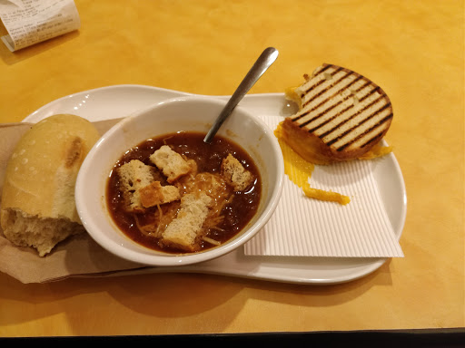 Dining area dirty. Took 5 minutes to find a clean enough table to sit down. Were out of the first 2 things I ordered. Third item had to be made differently because they were out of the bread. All three of my orders came out incorrectly. Out of clean silerware. Trash and food every where in all dining areas. Bathrooms were a mess. All 3 managers looked tired and miserable. Employees were nice, but more concerned talking with their friends than helping customers. It is 5pm on a Wednesday. Come on Panera, get it together!