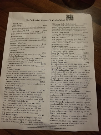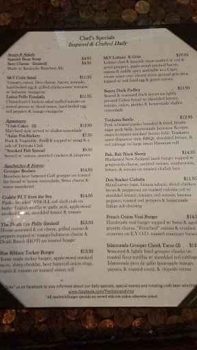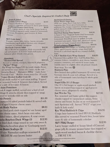 S&V is in a dumpy shopping center, but dont let that scare you. S&V has a great beer and wine selection. Overall, the menu looks creative (ie soft shell crab, royal red shrimp and Gunslinger Grits were the specials) and isnt your normal bar food. Was there mainly for drinks but felt adventurous and ordered the Crawfish Chowda as well as the Chili. Both were average. I was really hoping the crawfish chowda was going to be good, but it was mostly corn, potatoes, mushrooms and a few tiny frozen crawfish tails. The chili definitely had some kick. The waitress went ahead and brought out a side of sour cream for the chili, and then proceeded to charge us the 50 cents on the bill without even asking if we wanted the sour cream to begin with. The burgers looked pretty good