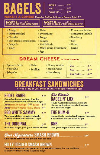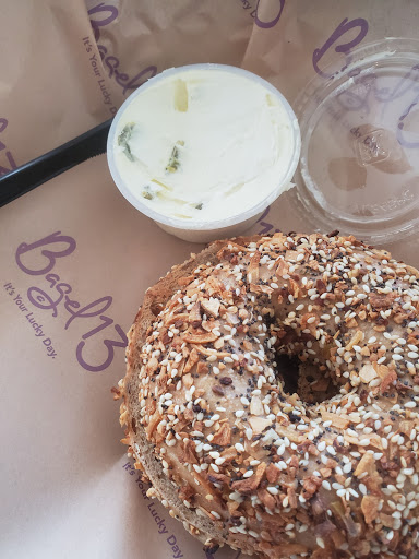 Fresh, delicious bagels, and a great flavor selection. The bagels are made on site, and are made like real NY bagels. They offer them toasted with the usual toppings, cream cheese, etc. They also have bagel sandwiches, my favorite is the Hum-B, which is your choice of bagel with hummus, cucumber and roasted red pepper. The Smash Brown potato is a perfect side, its a smashed, seasoned and grilled red potato. The coffee is roasted and ground fresh on the premises. They have almond milk behind the counter, ask for it if you dont do dairy. Service is very fast and very friendly. The bagel flavors include everything, salt, sun-dried tomato, asiago, jalapeno, plain, onion, and others Im forgetting...I tend toward savory not sweet. Bring home a dozen, which is actually a bakers dozen. Thats why they are Bagel 13.