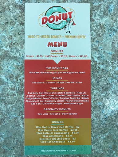 The concept brand name is a bit off, imo. Its less of an experiment and more of a 2-part customization of doughnuts. I expected to be able to get a bacon sprinkle doughnut with PB drizzle on a chocolate glaze...but you get one topping, one glaze-type choice, except on their pre-made experiment doughnuts which you can not alter. They should make the menu spots WAY more noticeable. Its a little cramped in there and when coming in there was a family in front of one and a patron in front of the other at the front of the store so we kinda just aimlessly looked around trying to figure out what to do. Other than those two little complaints, though... HOLY CRAP THESE ARE DARN GOOD DOUGHNUTS! The best kind! That kind of cakeyflakey friedish doughnut of amazementness that are just so awesomely delicious youve got to have someone there to swat your hand before you eat a dozen of them in one sitting! The bacon was the BEST one, hands down. The PB&J was next, followed by the fruity pebble and sprinkle one. The coffee was actually pretty good, too! I was surprised, to be honest. Actually, Im kinda hungry and I know where Im going right now! Update from 4/18/17: Bacon was still great. Coconut pretty plain, unsweetened flakes. Cinnamon sugar glaze just like the toast at home but on the awesomest bread. Sriracha was nasty imo...they were trying to recreate peanut Thai with sriracha, I think, by doing a sort of PB glaze covered in grahm crackers and a sriracha drizzle. Key Lime was def. limey, not bad. Maple glaze hardened up pretty quick...oreo was crushed really finely and was fantastic with the PB drizzle.