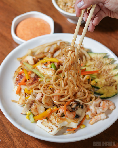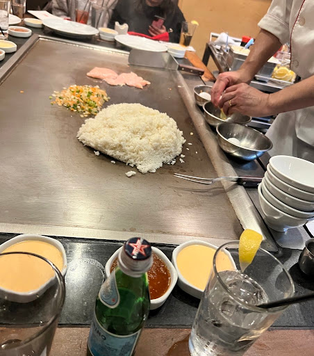 Todo la comida se procesa a la plancha pero con los mismos ingredientes esto incluye carne, pollo, camarones o langosta, arroz frito, etc. Se sazona básicamente con mantequilla con ajo, sal, pimienta y semillas de sésamo (ajonjolí) y salsa china para el arroz frito. Muy buen servicio, tanto chef como dependientes son muy atentos. El show del chef es mejor si no hay comensales asi que dedican más tiempo.