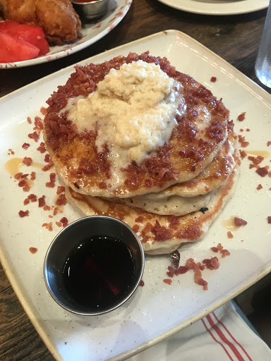 Food is usually yummy with interesting flavors like jalapeño bacon cheese cornbread. This time the cornbread had a crusty cheese on top and the taste was just average. The pancakes were not fluffy and the bacon and eggs flavors were overpowering ( according to my cousin). My hamburger was good but the pinkish meat was off putting ( supposedly beef mixed with pork on the patty) , the potato wedges were not crispy enough on the outside and too dense in the inside. It had a nice piece of pork bacon on top of the patties. The food is deceptively small but very filling so we ended up over ordering. My brother really liked his Fried Chicken with waffles along with hash brown with cheese wiz and he also ordered cheesy grits which is better than some that I have tried. Prices are $10 average per dish but the bill ended up being $250 for 7 people (and this is without any liquor , we all had water). Decor is comfy and inviting. Great place for brunch. They have a second floor seating also me they take reservations.
