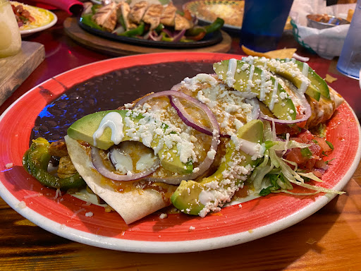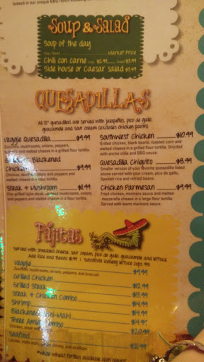 We stop here a lot on Saturday nights because its on the way home from our church service. No matter how busy it looks we have never had to wait for a table. There is plenty of seating both inside and out. The decor is kitchy south of the border. Normally I dont like restaurants with a ton of things on display because they invariably dont dust and its gross to see a pile of dust surrounding you while you are eating. If they dont clean here I wouldnt know because the interior is so dark that I couldnt see anyway. The menu is filled with Tex-Mex favorites like fajitas, tacos, and burritos. Dessert is of course a yummy fried ice cream, this version served with churros as well. They have weekday specials given to you on an insert with the menu. On this trip my daughter had a rib and barbeque chicken breast combination and I had the Chicken Maderia. Service is always prompt and friendly usually by young ladies. In the many times I have been here I have never had a problem with either food or service.