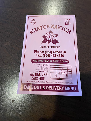 Best Chinese food in Davie, for sure. We get delivery from them about once a month and its always timely. The woman who usually answers the phone/works the hostess stand is very nice and always gets our orders right. I highly recommend Kanton Kanton.