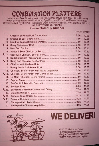 I was told this was the best place to eat Chinese food the place closed at 10 I showed up at 945 and all I wanted was chicken and broccoli when I ordered it and walked in to order there was nobody in the place except for one guy sitting there the place was kind of moldy smelling hardly any air conditioning and very plain and bland I had to ask the guy how the food was he says he didnt know he was waiting for his obviously a first time customer when the food came I asked the lady if I could sit down and eat real quick and she told me know they were still 8 minutes left before closing she said that I didnt buy enough food for first time customer that would have probably come back at least two or three times during that week stay I was treated poorly and told that my $10 $8.89 meal I would not allowed to eat there but if I spent another dollar twenty whatever it was I would be able to sit very disappointed I would not go there and to be quite honest the food wasnt that great at all chicken with broccoli with white sauce the broccoli was almost raw stay clear Harley no flavor