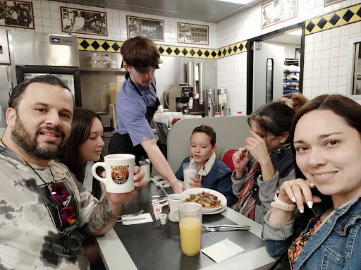 So weited 20 min for someone to tell me ill be right there in a sec. No good morning no smile on her face. 10 more minutes Dawn came to us and asked us for drinks again no greeting. Ask us what we wanted to eat we wanted steak w eggs and a cheesesteak came to us twice askn us if onions was fine on it when we already told her yes. 3 tables been durty tru all this time a fam of 4 sat down in one of the durty one and started cleaning up no one came to help them a family of 4 left cause no one went to them as am writing this she just came a drop the plates and then she left. Very rude very bad experience i always come here and been way more busier and my server is very pleasant but today horrible service and very dissapointed.