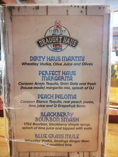 Food is amazing from seafood, burgers, salads, prices very reasonable and on top of this Draught Haus has the best Happy Hour around. 1/2 off alcohol drinks including top shelf and all draught beers and so many to choose from. Pizzas and Flatbreads 1/2 off during Happy hour. Think we have tried them all. Havent had a thing we wouldnt order again. Our menu Suggestions: meatloaf sliders, yucca fries, brussels spouts, and for pizza the Buffalo chicken and flatbeds tied between fried green tomatoe and Thai chicken. Treated like family here always greated with smiles and many warm welcomes. Management stops by to be sure we are taken care of each visit. If you havent tried breakfast at Clear-sky, your missing out. Excellent selection of regular breakfast with an upscale touch. Maybe its lobster or crab maybe shrimp yes that is on the menu for breakfast too.