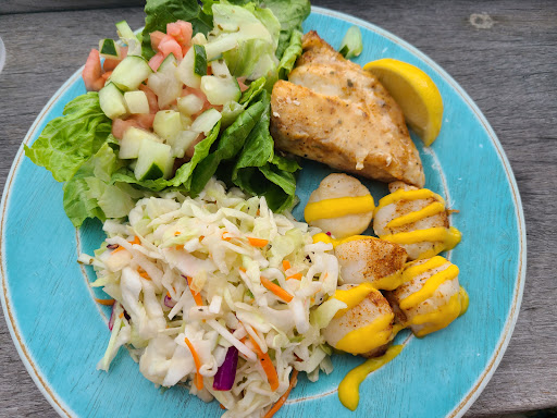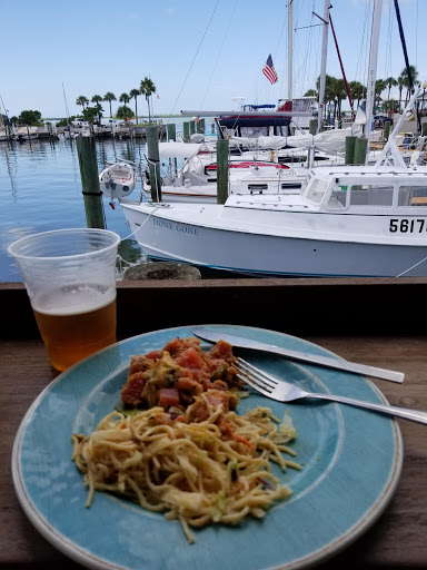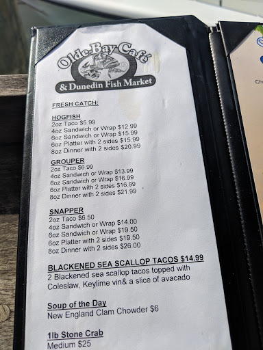 Four stars based on the awesome location. The food was sort of bland but I only ordered scallops and honestly was only there for the great view anyway! Dunedin Fish Market and the Olde Bay Cafe is located near the Dunedin Marina where a lot of people dock their boats. Its got a perfect view of the water and an AMAZING view of the sunset. It really cant be beat in this respect. You can grab a seat on the bar area which overlooks the water if you want to enjoy the day and partake in a great view of Tampa Bay. The place is pretty busy, presumably based on its location, but the menu has quite a few offerings in terms of fresh seafood and bar bites. I ordered scallops and a side of vegetables. I received four scallops for $12, which is SUPER pricy in my opinion. The scallops were just okay. I think they had the shells still on them? They were sort of crunchy and weird. The vegetables were pretty good, but nothing special. They were just steamed. I saw several people with peel-n-eat shrimp that looked fabulous and wish I would have gotten that, but alas! I did not. The crab cakes looked awesome too. So...honestly, Id give this place 2.5 stars for the food itself. It was pretty mediocre. The service was friendly and pretty quick though, which was nice since I was by myself. Id come back to see the sunset and to try out other menu items if I was in the area, but probably wouldnt actively seek to go to this place to eat again.