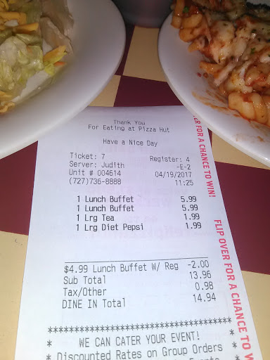 Nothing remarkable, but nice that it offers a lunch buffet. If youve been to a Pizza Hut before, you know what to expect. Lunch buffet is weekdays from 11:30-1:30, otherwise youll be in-and-out