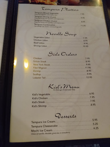 I will try to keep this short and simple and fair. Place is nice and up to date. Clean and looks like they take care of the place. Everyone is nice and professional. Now the not so good. My opinion. Over priced compared to other Japanese Steakhouses. 11.00 for hibachi chicken If you want what everyone else serves which is 2 choices? Its 20.00. Down the street those same 2 choices of meat are $5.00 cheaper. The waitress we had was serving too many tables and messing up orders and took forever. May have been her fault or not but its up to Mgmt to address those issues. We dont think we are going back.