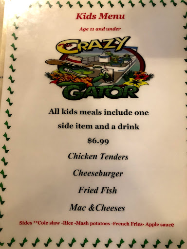 I was very disappointed with my experience. The restaurant was dirty and run down. The hostess told me to sit anywhere, and I couldnt find a clean table and sat at an unbussed table. It took over 20 minutes for a server to greet me, take a drink order and clear off the table. It took over an hour for my friend and I to get our food; a salad and a burger. The food was mediocre at best. I likely will not be returning to this restaurant, unless someone was dragging me there. Even if I go back, I will not be ordering food. I would highly discourage someone from eating at The Crazy Gator.