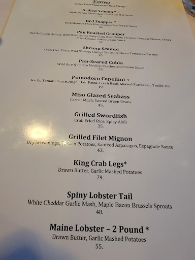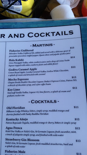 Ok well the twin maine lobster deal is gone.. AND the owner for some retarded reason took the Oysters off the menu. Hmmmm I guess the new lights at night are cool so you can see the fish but I mean I was coming for the food. I cant say enough about the location and the fish feedings and stuff, but I just went tonight 12-01-2008 and have been going since august a couple times a month and now im sorry to say i dont think ill be coming back until they fix the menu. I mean come on its a "fisheries"????? without oysters? Anyway if you are the owner and are reading this Ill be calling every month to see if all is fixed and youll have my business but until then its unfortunately South Port, Blue moon.. or some of the other fine seafood places down here. You were my favorite! August Review: DOWNSTAIRS: Twin maine lobsters 29.95!! awesome.. tasty as hell. Oysters were perfect and big. First time there at 6pm and they were feeding tarpon at the dock.. good show.