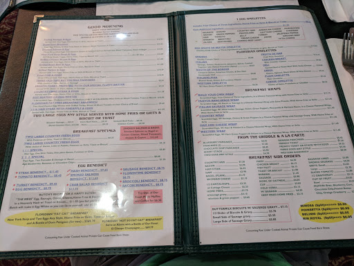 I wouldnt even give this place one star. They were worse than Tropical Acres. It took us twenty minutes to find paid parking. The menu was great. It had alot of choices at reasonable prices. Unfortunately, the service was terrible. We had to wait over half an hour just to place our order and there were only a few customers. Then it was another 45 minutes before our food arrived. The food was stone cold and my chop steak was cold, but badly burnt. They tried to hide it by covering it with chopped onions and bacon. I was unable to eat the corn on the cob because it was so cold. Nor could my husband eat his Brocoli for the same reason. The waitress placed the check down at the same time as the food and never came back to check on us. The bill had four dinners and two sodas on it. It was 50 dollars. We were overcharged 25 dollars. It took me another 25 minutes to get the bill corrected. She thought we should pay for what we didnt order or recieve. We were hoping to have a pleasant experience. That was not the case. This was the first and last time we will ever go to the Floridian.
