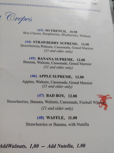 Very nice. Large crepes and large cups of coffee. You can bring a bottle of wine or champagne no corkage fee, plus they give you glassware. Very nice place with a fountain out the window