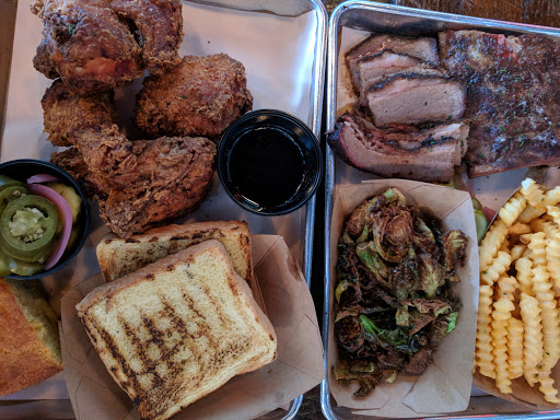 Second time going but this time we decided to dine in and tbh I dont know why we took so long to try this place. Bartender, Chris, was amazing made great conversation and made the experiencr more enjoyable not to mention the regulars spark up conversation as well. Food was outstanding we had the family fried chicken our first time and decided to try the pitboss this time with extra sides. We ended up with 4 meats and 2 sides for less than what weve spent at a lot of other places. The Brisket was tender, ribs were very juicy, Bacon Brined Pork was delcious and the Jalapeno Sausage had just enough umph. It was all very well seasoned and flavorful. We had Collards, Cornbread, Fried Brussels (I see why this is a favorite), and Cowboy Mash. I cannot rant enough about how good the sides were. Food is 5 stars didnt even reach for the 5 sauces we had available. Going back again later this week to try more items.