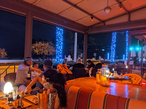 This was a great location for meeting with a new business group. Sun, sand and surf is always a nice combination of ingredients for meeting and mixing with new people. This was a cocktail and app get together with about 30 people. We were given a very nice area by the bar with a good view of the ocean. It was relatively quiet, so it wasnt difficult to talk and get to know people. The decor was warm and relaxing. I started with a drink, the berry mojito. It was a smooth combination of Bacardi Wolfberry, with fresh strawberries, blueberries, lime and mint. It was refreshing but needed a bit more kick. The glass was fairly small and a lot of the space was taken up with berries, so it wasnt a great value. Happy hour is $3 off of the usual $12 price, so its not the best happy hour value. There were a number of different apps served. I sampled 3 types of hummus with pita wedges. All were nicely seasoned. There was a wok charred edamame with soy, togarishi and smoked salt. It was messy to eat, but really delicious. We were also offered several different sliders, so I went with one that was a roast chicken and another that was a spicy beef. While I couldnt say exactly what was on either of them, both were very good. The beef was especially flavorful and had a fairly significant amount of heat. Overall, it was a very nice experience. Id like to go back and try the full menu. :)