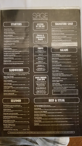 Ive had one nice lunch experience here, and one bad one today. The nice lunch experience gave us friendly service, a charming waiter, and very delicious French food. The one common negative thread with both visits was the extremely salty food. Their food, while delicious, makes me feel parched for the rest of the day. My favorite part about this restaurant is the 2 for 1 lunch special during the Summer, and the creme brulee. Todays experience made me think that there must have been some problem with the kitchen or the staff. The hostess was not friendly, and seemed distracted, having a conversation with a man who walked in after me while I was waiting to be seated. In fact, he had to tell the hostess, "hey-I can talk to you later--that lady is waiting to be seated." Wow! I thought I was invisible for a second. After being seated, we waited 15 minutes to be approached by a server who said nothing, and simply placed water and bread that was cold and mushy in the middle on the table. We waited another 10 minutes to actually be greeted by a server who was doing the best job she could despite what seemed like the restaurant being understaffed. Our lunch took a very long time to come, and my quiche was oversalted, the crust was mushy, and it was actually cold in the middle. Gross. :o( It seems like the kitchen knew they were behind, and they were letting shoddy food be sent out while not paying attention to getting the temperature right. Our one course lunch took 2 hours and completely obliterated our one hour lunch break. The back near the bathrooms is always dark and dingy with pictures that they never took the time to hang just sitting on the floor. I always question a bathroom thats dark because I feel like it hides things they dont want you to see. This especially scares me because they were closed in 2009 for health violations and a roach infestation. I may try Sage one more time to give them another chance. I am hoping today was a fluke. However, I am consistently put off by the salt content in their food. I wish this is something they would change.
