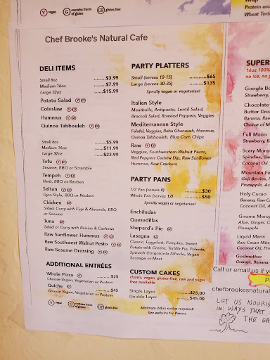 I went to Chef Brookes Natural Cafe today and I will NEVER return again!!!!!! Madam Brooke has the worst attitude I have ever come across in my life. My family and I are from Jersey, Channel Islands, U.K and we own a property in Fort Myers. I am a raw vegan. I placed my order for all sorts of food to take away today and she told me that I was not allowed to stand by the counter and wait for my order and that I had to sit at a table. I told her that I did not wish to take up a table as I was waiting for a take away, and that it was not fair to other people that wish to eat in. She was so very rude to me, that I walked out and went to ADAS just up the road. Now I can totally recommend Adas for wonderful food, juices and everything healthy, plus there is another wonderful vegan restaurant called the Loving Hut, on Pine Ridge Road, Naples. I will be posting my report onto facebook as well. Mrs Kate Forde