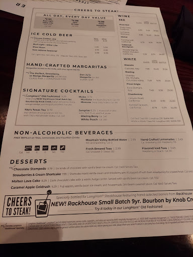 Meh. Im not that picky. My ribeye was good. My waitress was pleasant and prompt. The floor was SUPER SLIPPERY even under my table. Feet were sliding all over. Table was greasy. I had to wipe it down. The staff kept SLAMMING the back door, really loudly. My salad was just an assault on vegetables everywhere. White lettuce in HUGE chunks, very runny dressing plopped all over it and the tomato were suspect as to their freshness. The baked potato didnt seem cooked enough and fyi they put everything on top. Its not exactly cheap to go out and have a lack luster experience at about $25 a person. Im so over Longhorn.