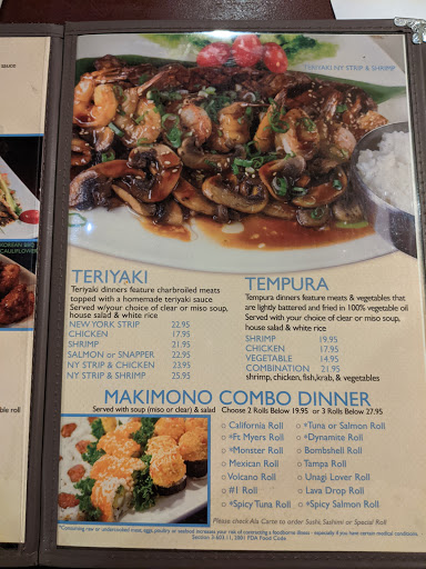 We are new to the area and found this restaurant after a quick search for "romantic restaurants in Fort Myers" to celebrate our anniversary. My husband loves sushi so thought wed give it a go. I was almost 6 months pregnant at the time so I checked the menu out before and was pleasantly surprised with all the non-sushi items! Arrived here late Thursday evening and it was quiet, not busy at all. Cute decor, really nice environment. I got chicken fried rice with clear soup (which was delicious, first time trying it!) and my husband got 2 rolls and Yakisoba. He loved the rolls and said next time hed just get those as the Yakisoba was good but not really noteworthy. Waitress was very friendly. Prices were pretty reasonable. Will come back again!
