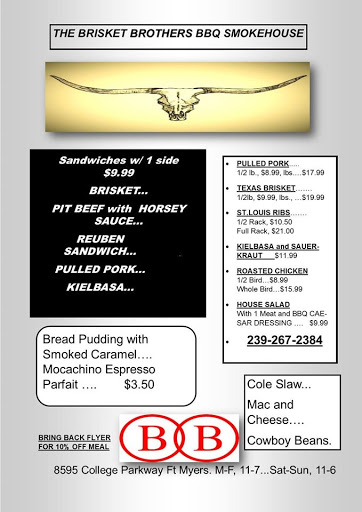 Wed been meaning to try Brisket Brothers for some time and were glad we finally did. The owner was extremely pleasant and helpful as we placed our lunch orders. The brisket and chicken dinners were both moist and delicious and the portions were generous and reasonably priced. Weve eaten many times at a large downtown Fort Myers Craft beer restaurant that features brisket. The first couple of times the brisket was great but the last three visits were seriously disappointing. If youre in the mood for great brisket, probably the best Ive ever had, head to College Pkwy and give Brisket Brothers a chance just as soon as you can.