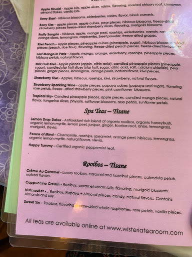 My friends and I have been coming here for the past year and its our favorite thing to do on a Saturday afternoon. Weve been about 4 or 5 times and yet the experience is always new. We try different teas every time and they are always so tasty! And we enjoy having lunch as well. We usually get either the Mac n Cheese with a side of the Chicken and Wild Rice Soup (my favorite) and the Turkey on the Croissant sandwich. Even when its packed the service is a little slow, the expereince is pleasant. The gift shop is also my favorite part, it has so many beautiful things! We love Bobbie, she is iconic to Wisteria just as much as the tea. We cant wait to go back again!
