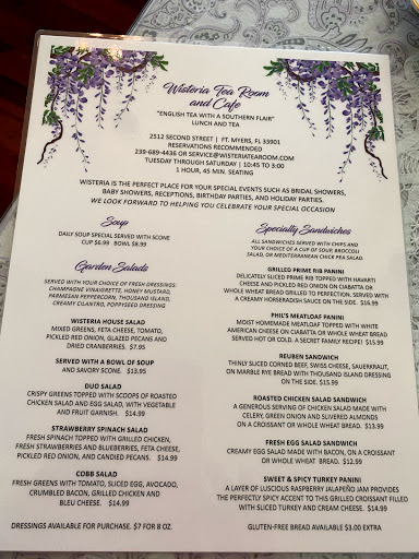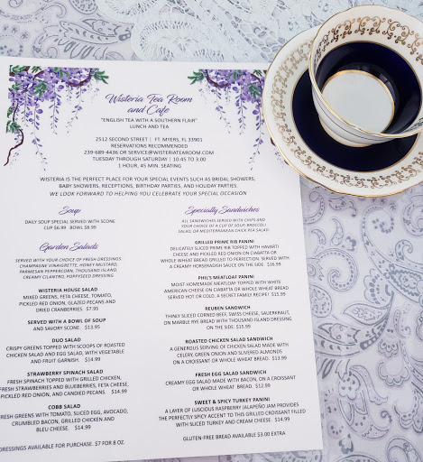 I absolutely love going to Wisteria Tea Room...I live nearby in Fort Myers and have eaten there dozens of times. EVERY time it is fantastic. Always keep on going back! Theyve just expanded the interior to give more room for their gift store. Their taste is spot on for great gifts and surprises. You can purchase Gift Cards on their website too!