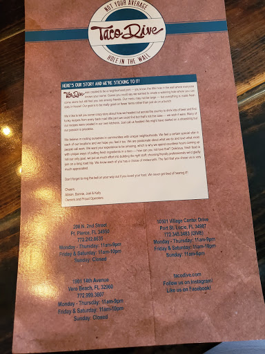 My family visited Taco Dive on a Thursday evening and had an amazing experience. The food was simple and delicious. The atmosphere and decor was created with thoughtfulness and as a patron I appreciate that. There was a steady flow of customers but service was still excellent. We will definitely be back the next time that we are in Ft. Pierce.